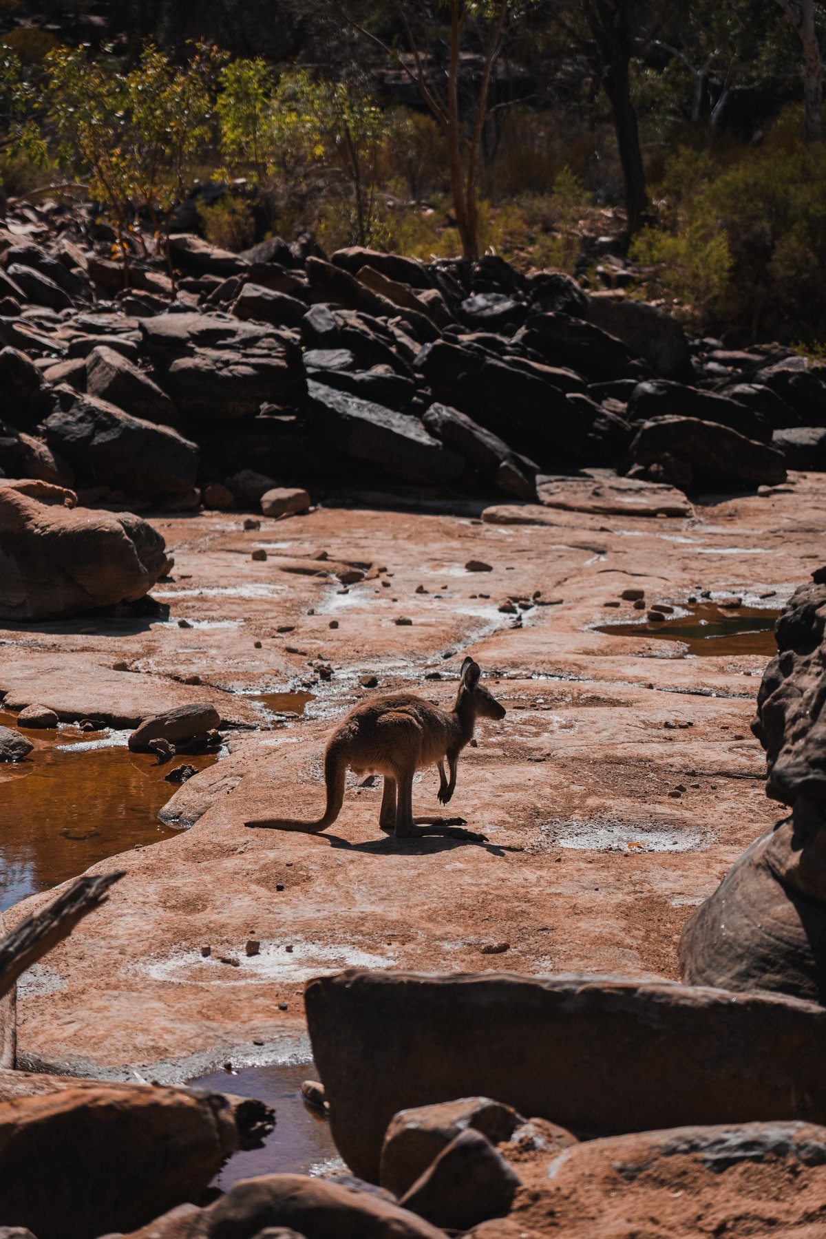 Od parkoviště vede krátká, nenáročná stezka k vyhlídkové plošině, odkud se otevírá nádherný pohled na řeku Murchison, která protéká hlubokým pískovcovým kaňonem. Pokud máte chuť na menší dobrodružství, můžete sejít blíže k řece a užít si klidnou atmosféru mezi skalními útvary, kde se často zastavují ptáci a další divoká zvířata. Cesta je trochu náročnější po kamenech, ale dle ukazatelů jde o 150 metrů – podle nás je to dál, ale i tak jste dole za chvilku. Nám se dole poštěstilo přímo u vody vidět několik malých klokanů, od kterých jsme byli opravdu kousek.