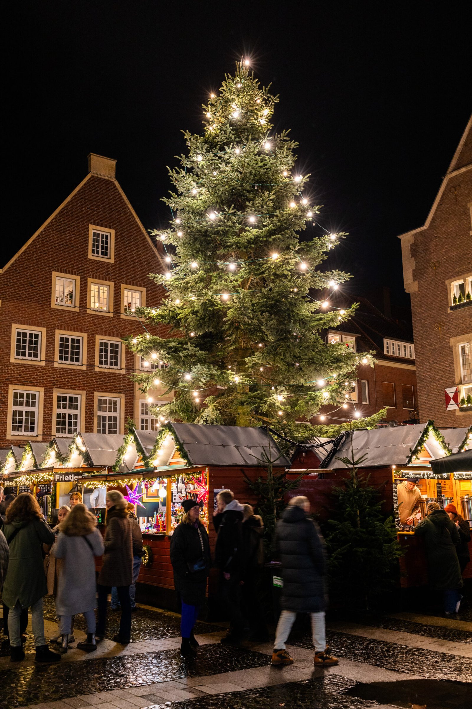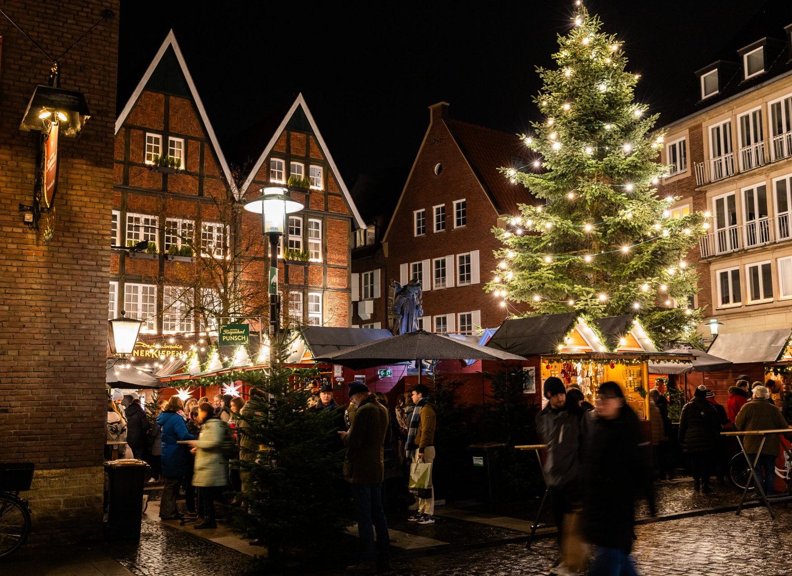 The Kiepenkerl statue is a beloved Münster landmark, symbolizing the city and the surrounding Münsterland region. The term Kiepenkerle once referred to itinerant traders who traveled the countryside selling their goods. Around the statue — beneath a large glowing Christmas tree — you’ll find a welcoming market known for its excellent gastronomy, including mulled wine, punch, and hearty Westphalian specialties.