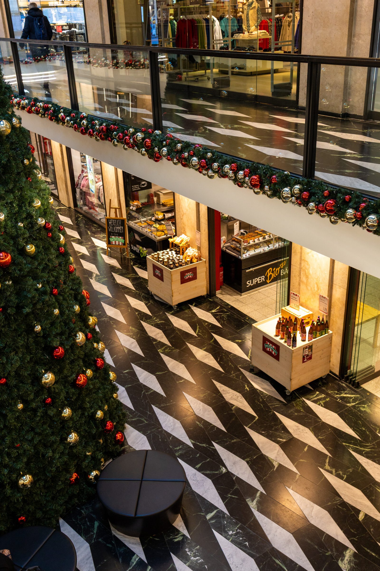 During the Christmas season, the gallery transforms into a winter wonderland — beautifully decorated with sparkling light displays, elegant garlands, and a majestic Christmas tree. Don’t miss the Danish lifestyle store Søstrene Grene in the basement, where you’ll find plenty of creative holiday ideas and gifts. The large Thalia bookstore offers a wide selection of wall calendars, along with an excellent range of English-language books and international magazines. In the center of the gallery, you’ll find a stylish bistro serving delicious specialties from the famous Holstein Delikatessen. For a sweet treat, stop by Eiscafé Milano, a popular ice cream shop that completes the culinary experience.