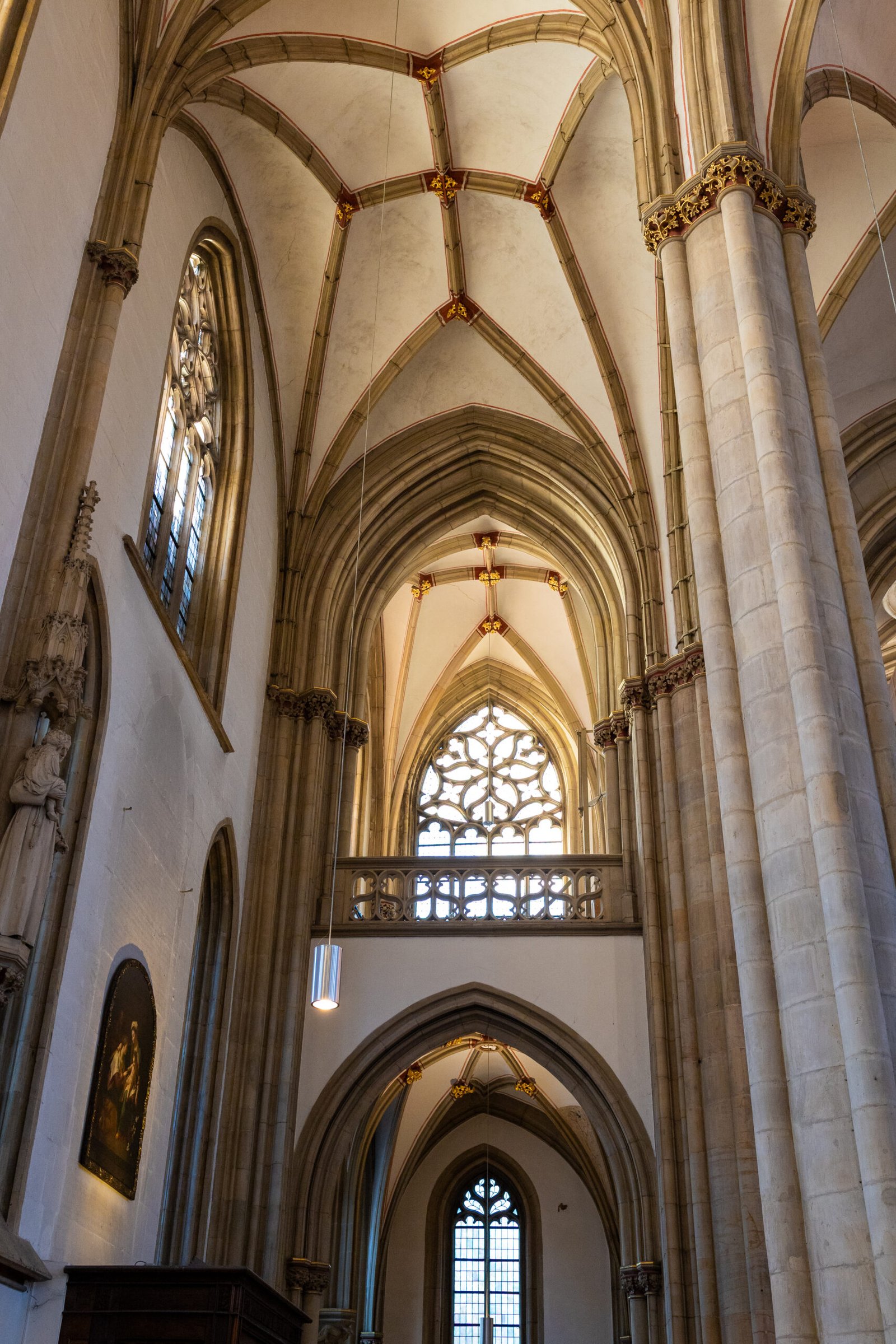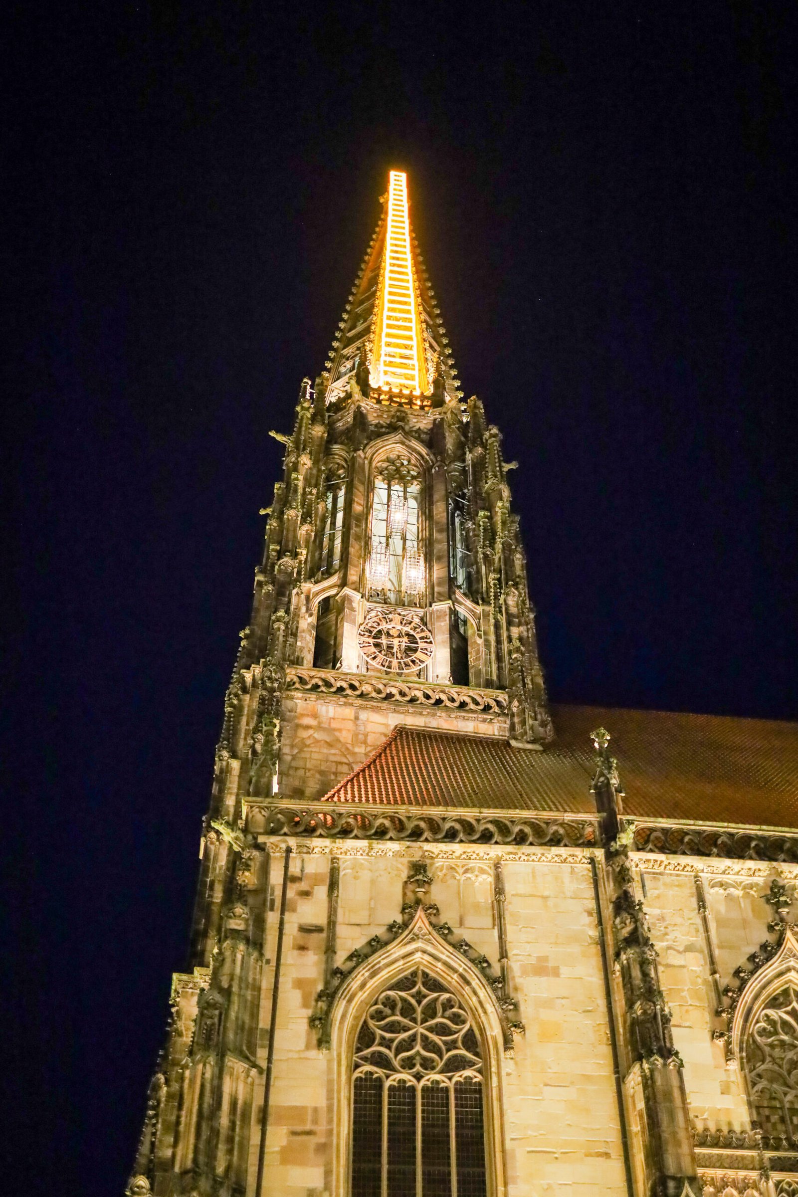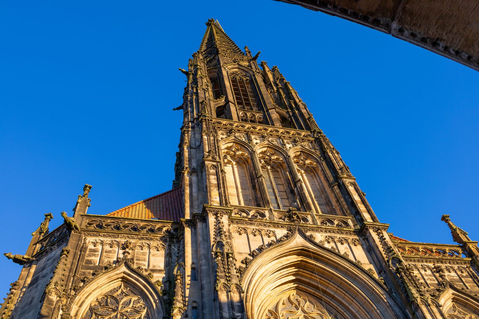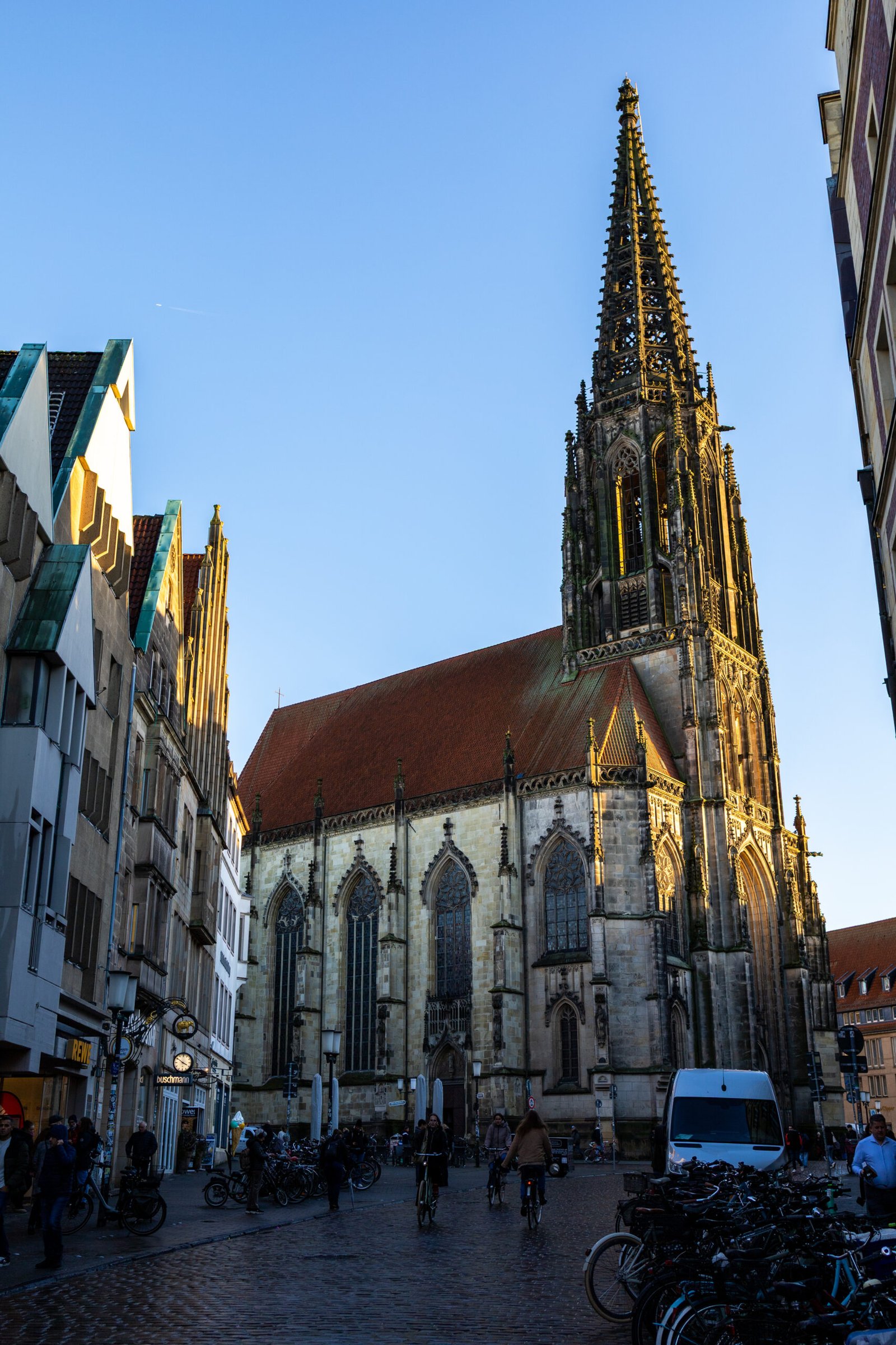 Built in 1379 by Münster’s merchants, St. Lamberti’s Church is a magnificent example of late Gothic architecture. Three iron cages still hang from its tower — a somber reminder of the Münster Rebellion of 1536, when the bodies of its leaders were displayed there. Since 1987, three lights have shone from the cages in memory of their souls.The church’s 90-meter neo-Gothic tower once housed a lookout who kept watch for fires and danger. To this day, a female trumpeter plays from the tower every evening, her horn sounding across the sleeping city.