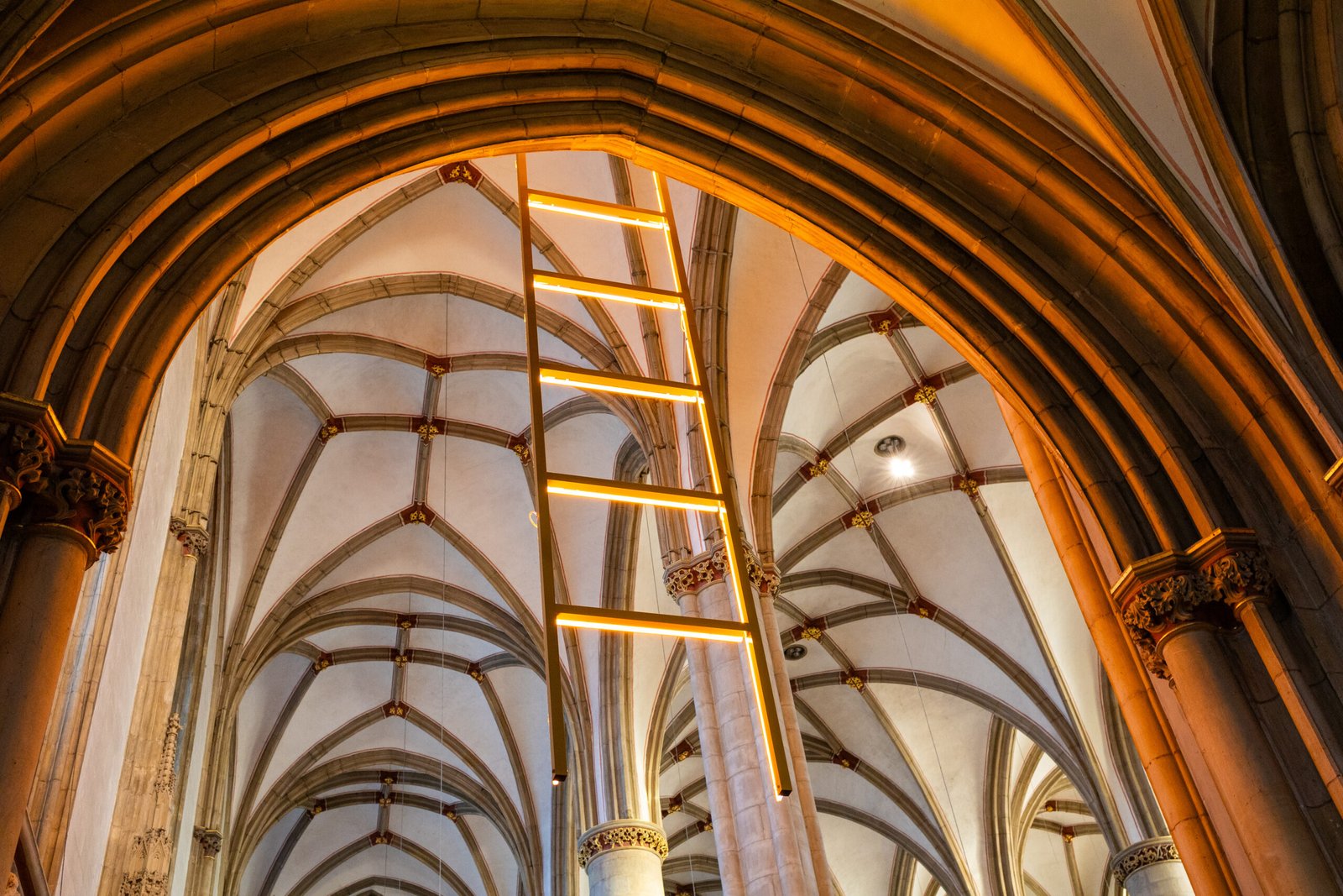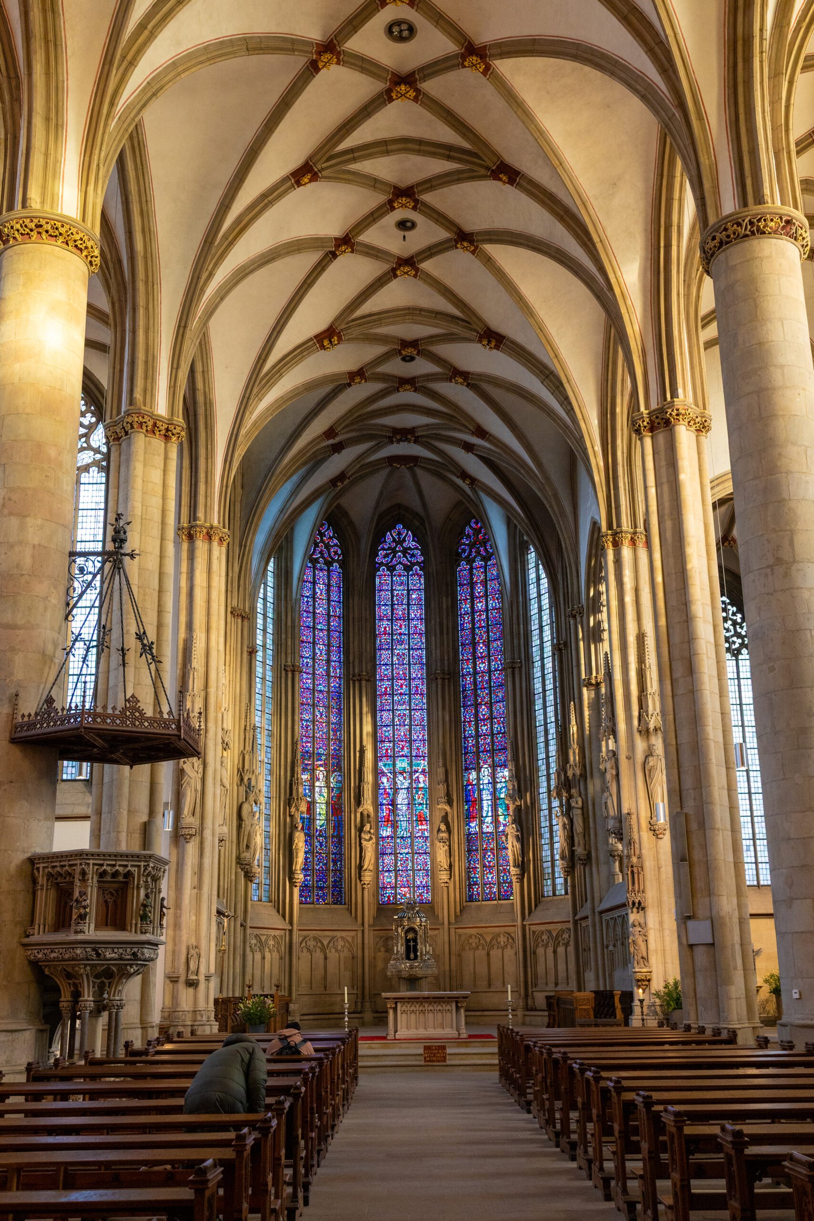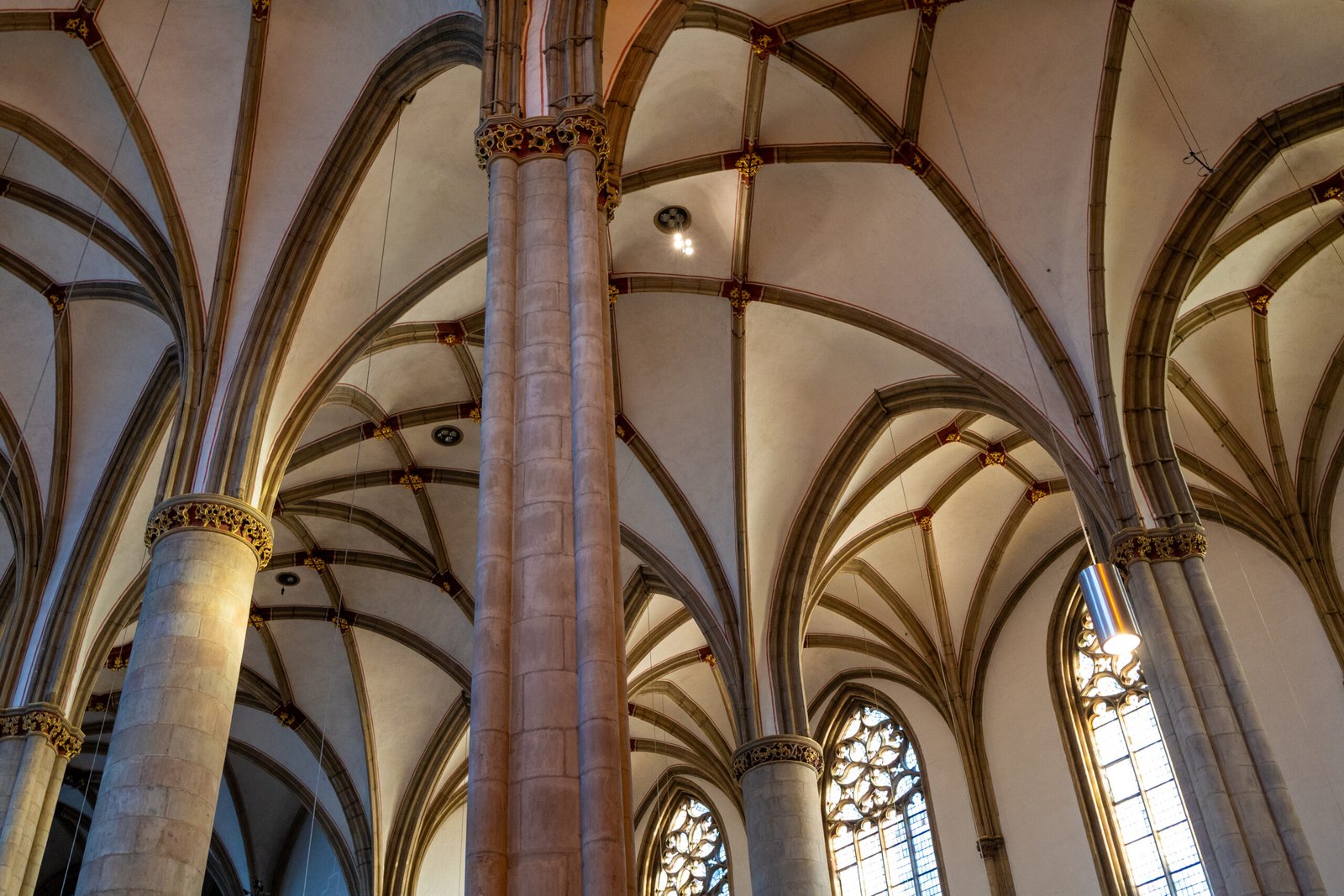 Built in 1379 by Münster’s merchants, St. Lamberti’s Church is a magnificent example of late Gothic architecture. Three iron cages still hang from its tower — a somber reminder of the Münster Rebellion of 1536, when the bodies of its leaders were displayed there. Since 1987, three lights have shone from the cages in memory of their souls.The church’s 90-meter neo-Gothic tower once housed a lookout who kept watch for fires and danger. To this day, a female trumpeter plays from the tower every evening, her horn sounding across the sleeping city.