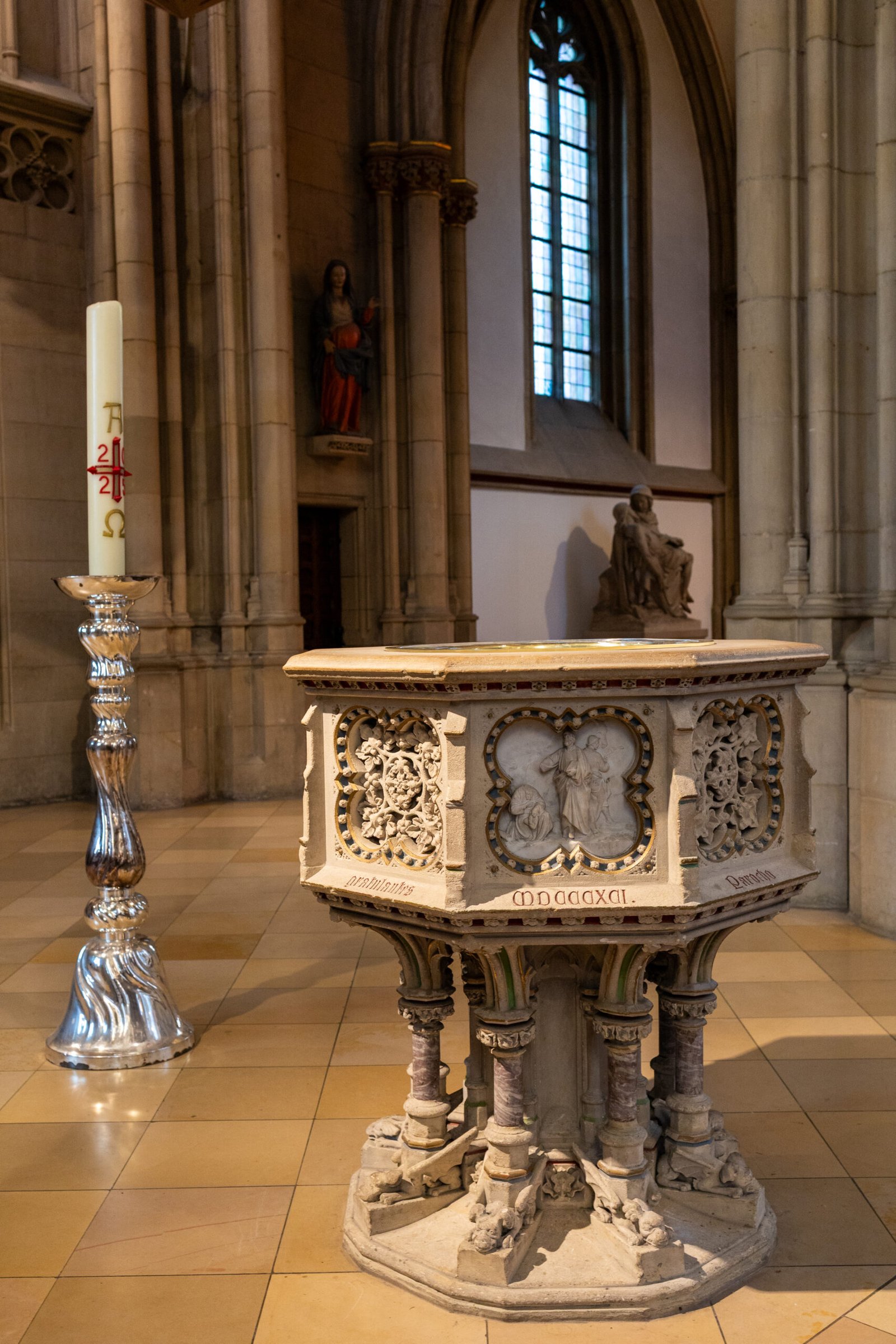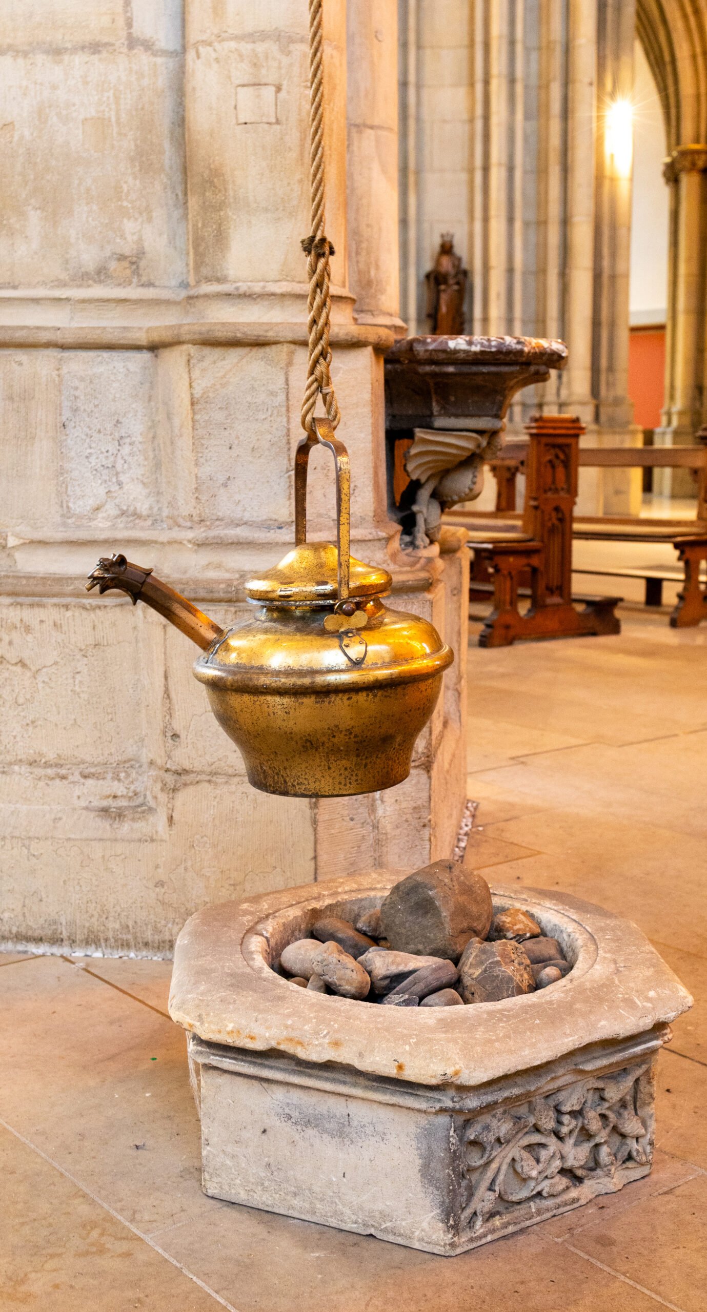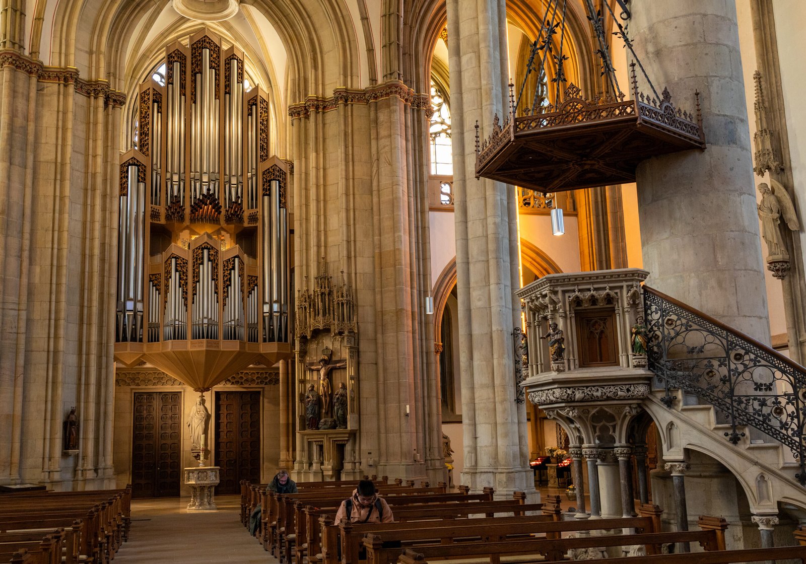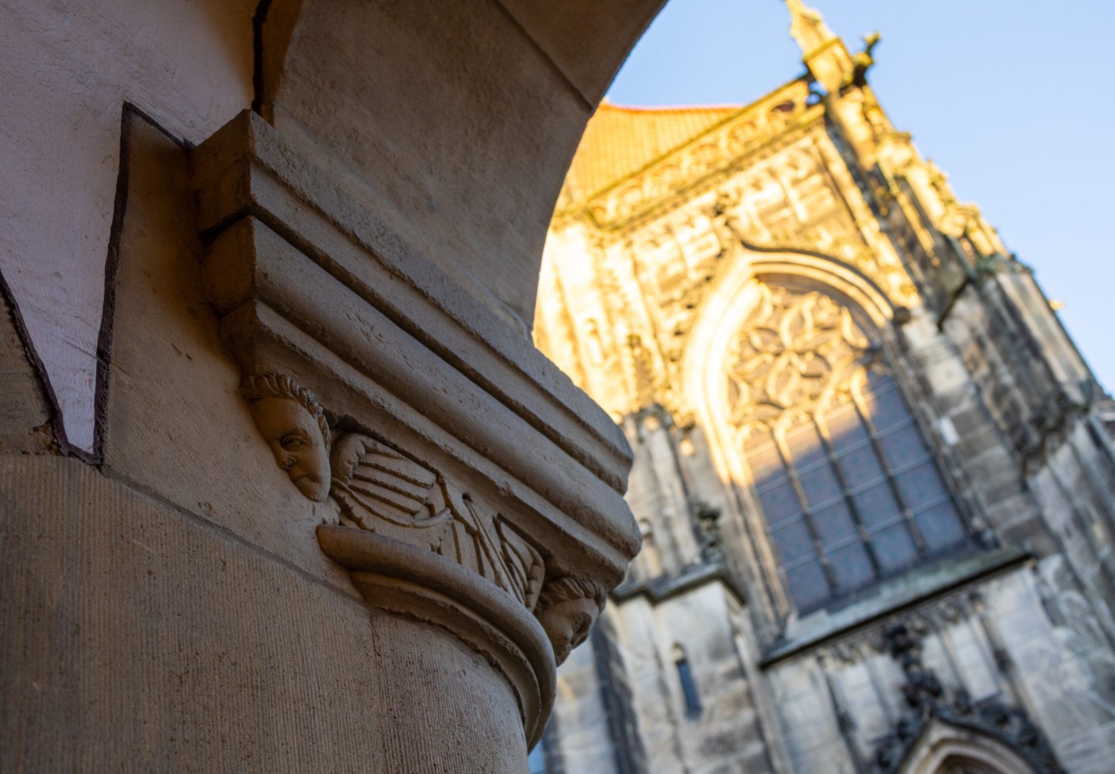 Built in 1379 by Münster’s merchants, St. Lamberti’s Church is a magnificent example of late Gothic architecture. Three iron cages still hang from its tower — a somber reminder of the Münster Rebellion of 1536, when the bodies of its leaders were displayed there. Since 1987, three lights have shone from the cages in memory of their souls.The church’s 90-meter neo-Gothic tower once housed a lookout who kept watch for fires and danger. To this day, a female trumpeter plays from the tower every evening, her horn sounding across the sleeping city.