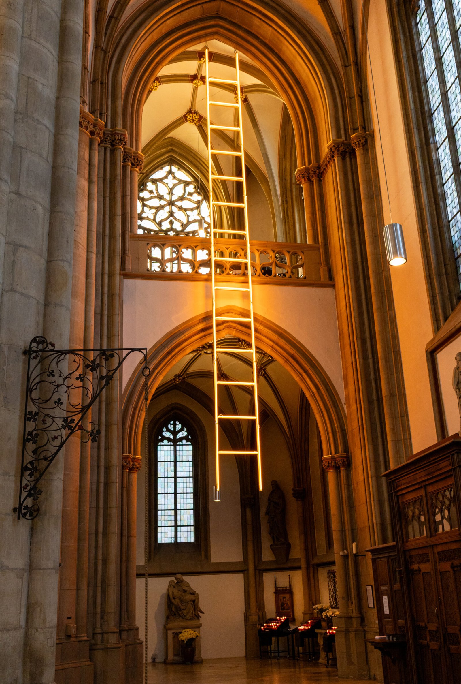 Since 2022, the “Himmelsleiter” (Heaven’s or Peace Ladder) — a 48-meter illuminated art installation by Viennese artist Billi Thanner — has adorned the tower, symbolizing hope and peace, visible from across the city center.
