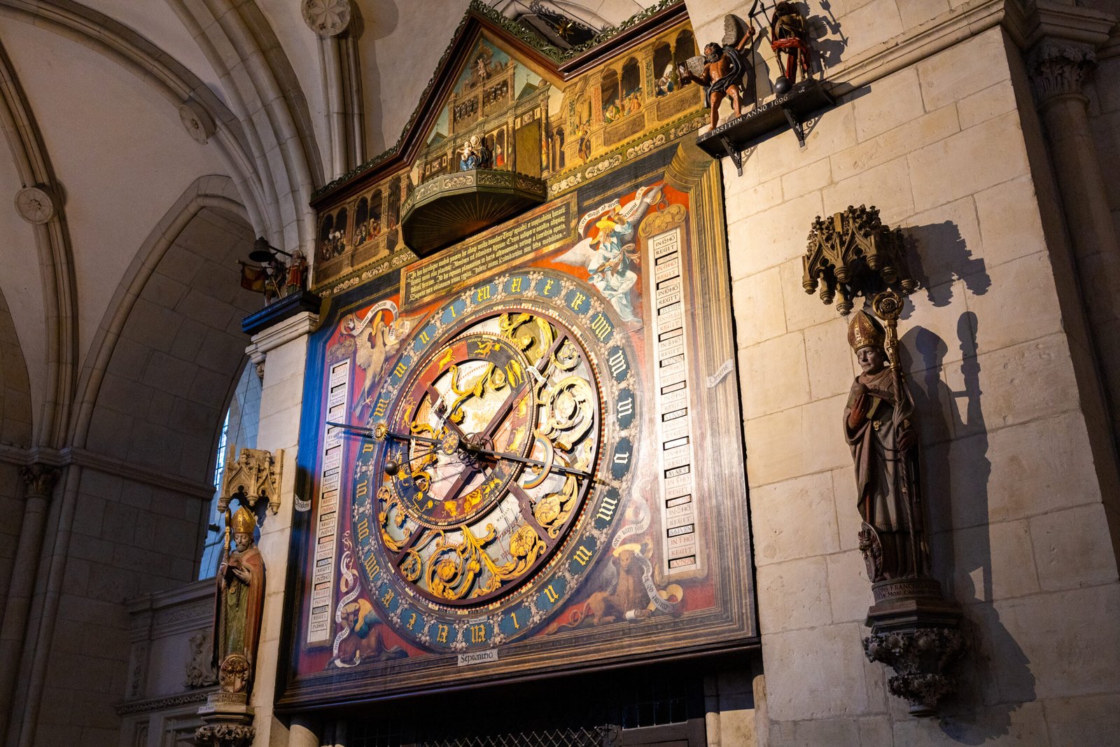 Inside, one of the cathedral’s most fascinating treasures is the Astronomical clock, dating from the 16th century. This intricate timepiece not only marks the hours but also displays the phases of the moon and the movement of the planets. Every day at 12 noon, the clock performs a charming mechanical show, enchanting visitors with its centuries-old craftsmanship.